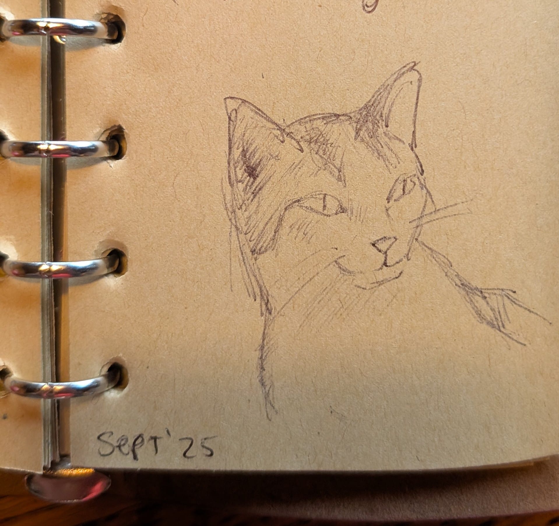 For the first park we stayed in Packwood, and for the second we stayed in Sequim (which, for non-locals, is pronounced like squid (with an M) and not like sequin (with an M.)) We had an incredible view of Sequim Bay as well as a friendly neighborhood cat, so I drew the first in my sketchbook and the second on the guestbook.